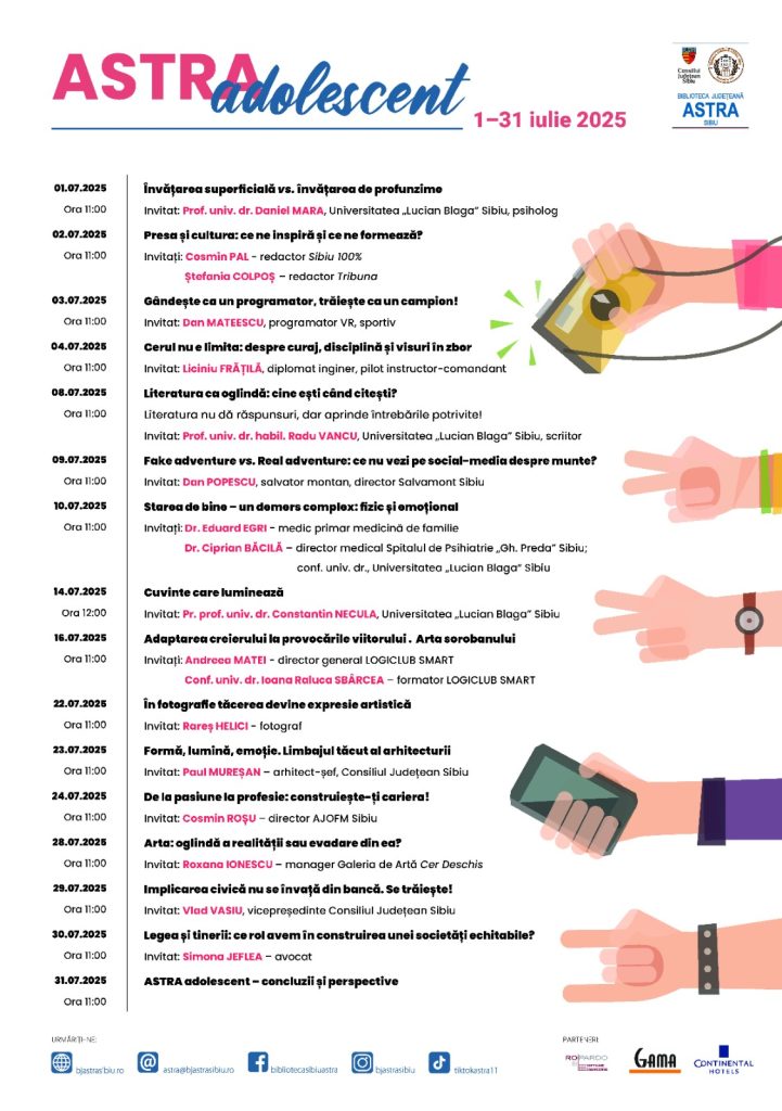 Cea de-a cincea ediție a programului de vară „ASTRA Adolescent” debutează în prima zi a lunii iulie 2025, la biblioteca publică sibiană, instituție care beneficiază de susținerea financiară a Consiliului Județean Sibiu. Tinerii cu vârste cuprinse între 14 și 18 ani sunt invitați să participe la activități care le oferă atât oportunități de dezvoltare personală, cât și un mod plăcut și creativ de a-și petrece timpul liber într-un mediu prietenos și deschis.