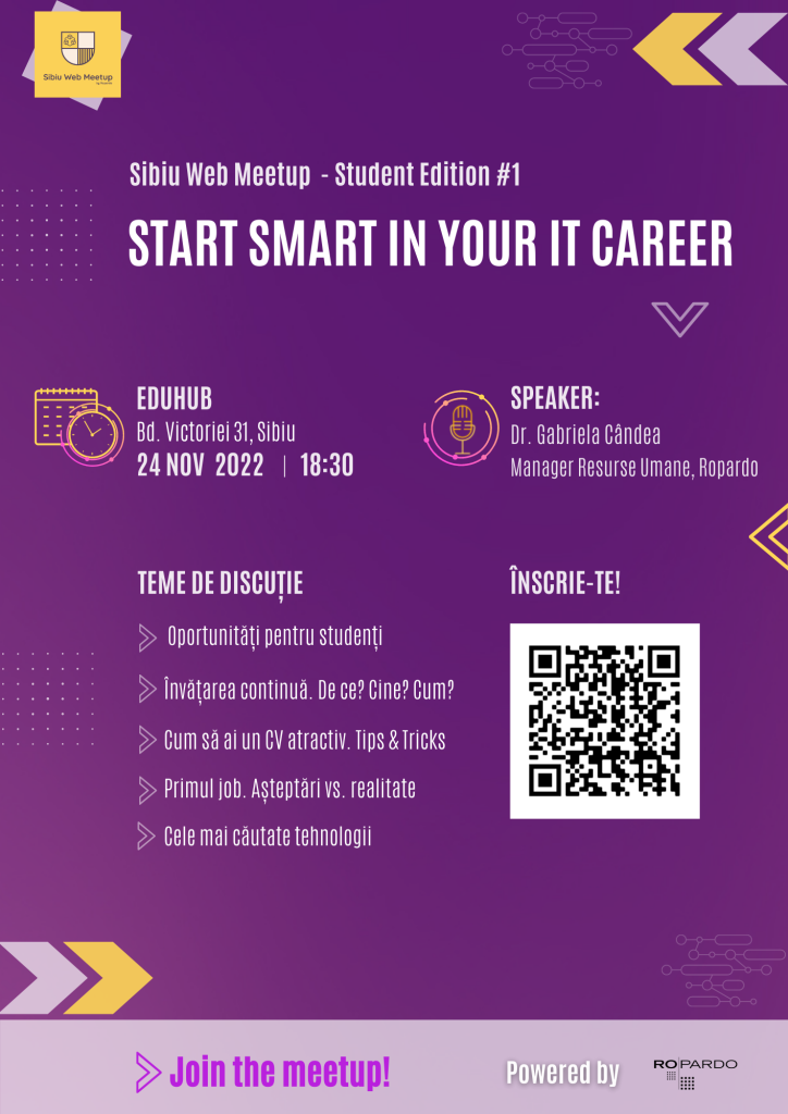 De reținut, înregistrarea video a întâlnirii va fi publicată pe canalul de YouTube al Sibiu Web Meetup, după terminarea evenimentului. Astfel, studenții vor putea reda cu ușurință informațiile necesare lor.
